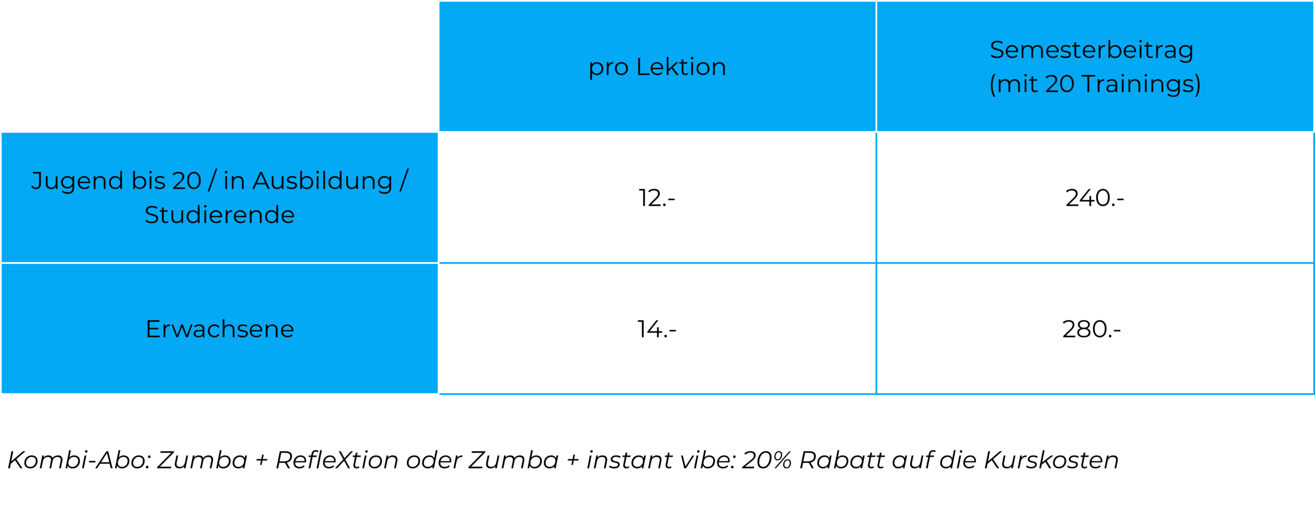 Unsere Beiträge richten sich nach der Anzahl der Trainingseinheiten pro Semester. Ein Semester umfasst in der Regel 20 Einheiten und dauert jeweils von August bis Dezember sowie von Februar bis Juli. Bei Abweichungen passen wir die Beiträge entsprechend an.